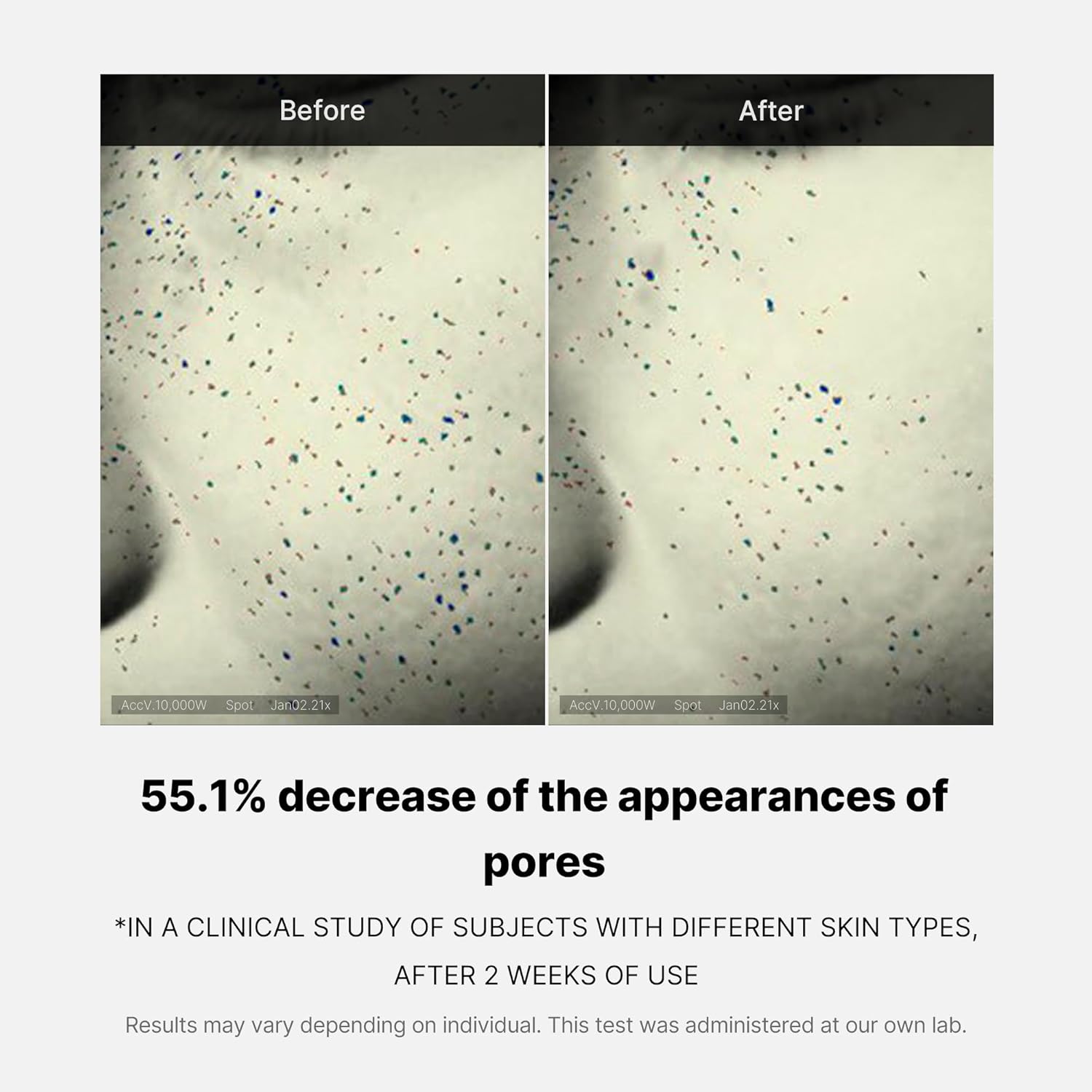 Klinik testlere göre tek kullanımda dahi gözenek boyutunda gözle görülür azalma sağlanabilir.